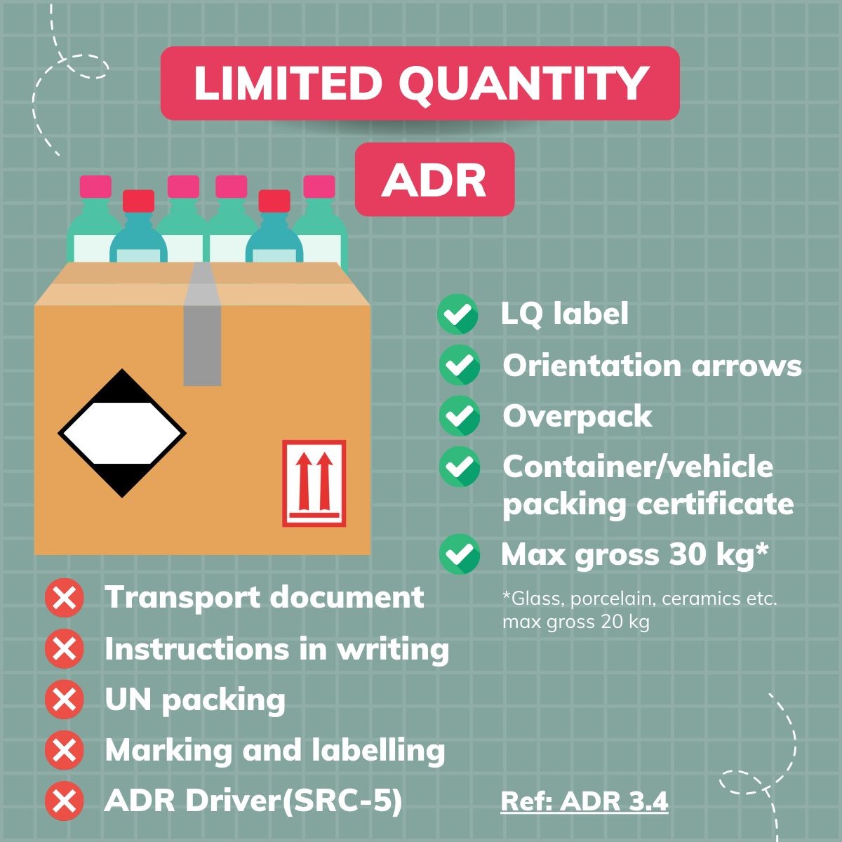 ADR labelling – all boxes and containers on a pallet must have correct labelling and the labels on all containers/ boxes/ receptacles must be visible.